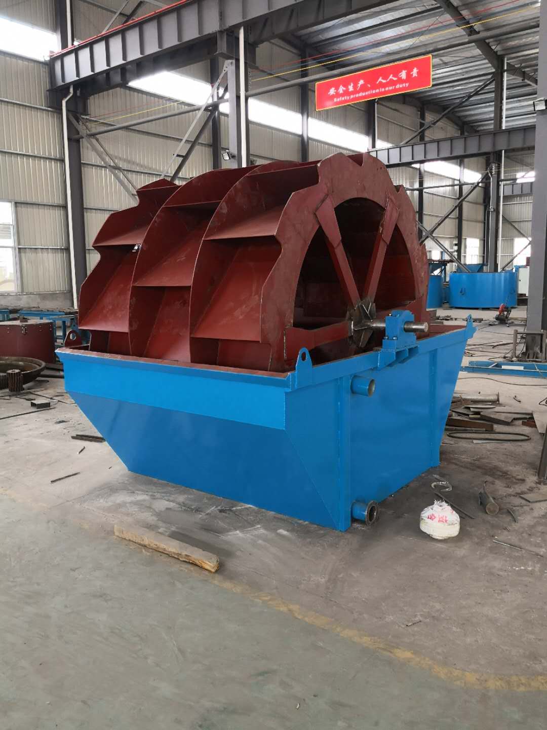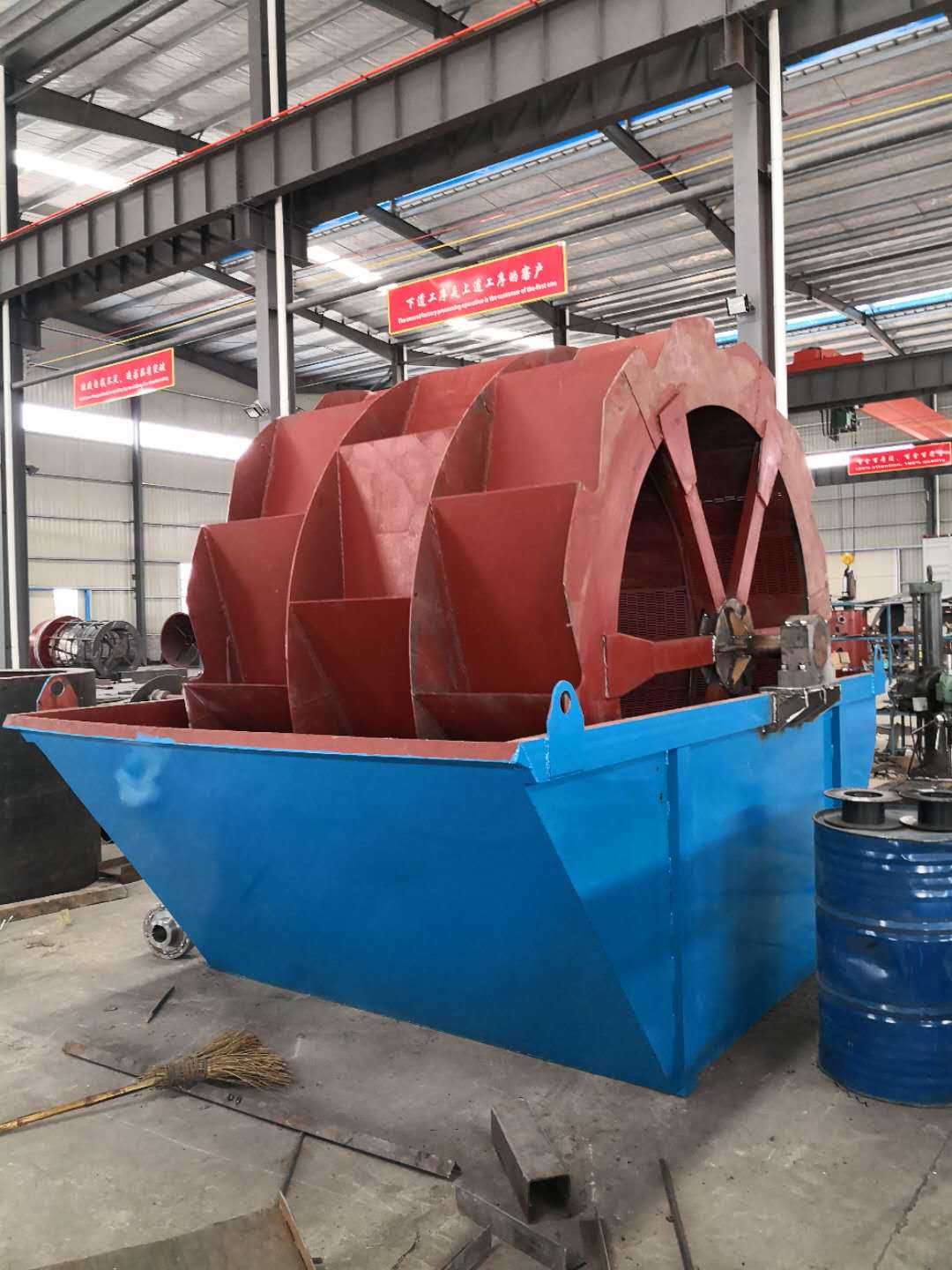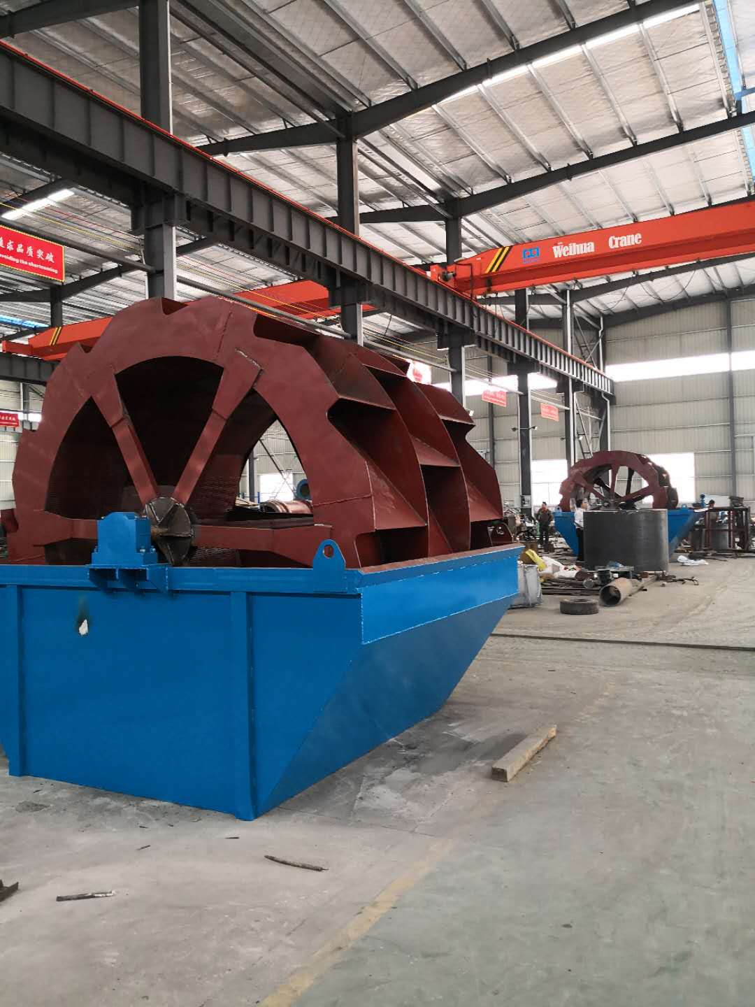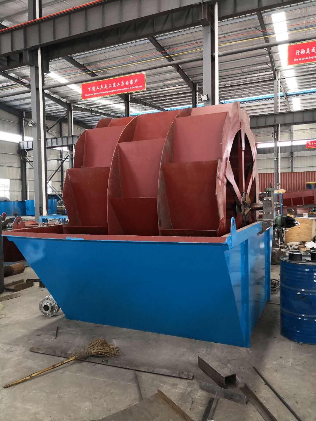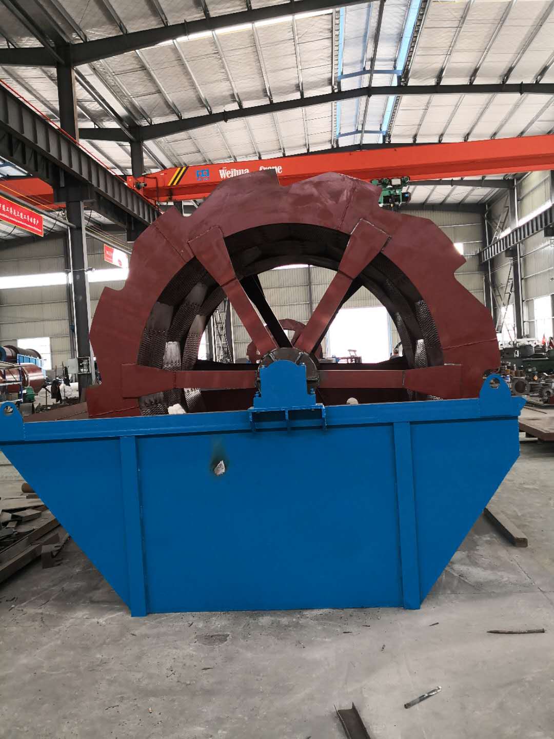 電機通過(guò)三角帶、減速機、齒輪降速後帶動水輪緩慢旋轉,沙石有送料槽加入洗(xǐ)槽中,在水輪的牽(qiān)動下翻滾,並(bìng)相互研磨,去除覆(fù)蓋沙石表層的雜質,同時去除包覆沙粒的水汽層,以利於脫幹;連續加水,形成強勁水流,適(shì)時將雜質及比重小的雜(zá)質衝走,並從溢出口洗槽流出(chū),完成衝洗作用。幹淨的沙石由葉片帶走,最終沙石(shí)從轉動的葉輪倒(dǎo)到出料槽,達到砂石的衝洗作用。