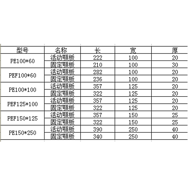 進料(liào)口尺寸(毫米) | 100×60 | 100×100 | 100×125 | 150×125 |